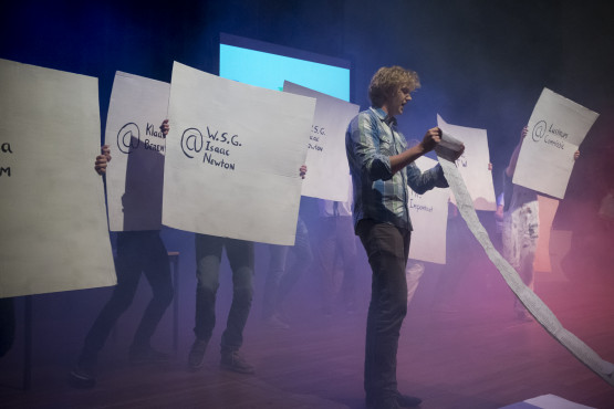 De voorstelling werd afgesloten met het inzetten van het Newtonlied, begeleid door het orkest, en het publiek zong uit volle borst mee. Het toneelstuk werd opgedragen aan Peter van der Hoogt.