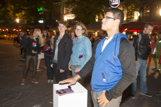 Spelontwikkelaars Erik Kijk in de Vegte (Kunst en Techniek, Saxion) en Sefrijn Langen (Industrieel Ontwerp) kijken trots naar de lange rij voor het spelletje. Erik: ‘Toen de UT opdracht gaf tot ontwikkeling van dit spel waren we meteen stoked. Het voelt geweldig dat zo veel mensen het willen spelen. De beleving is intenser dan ik had verwacht.’