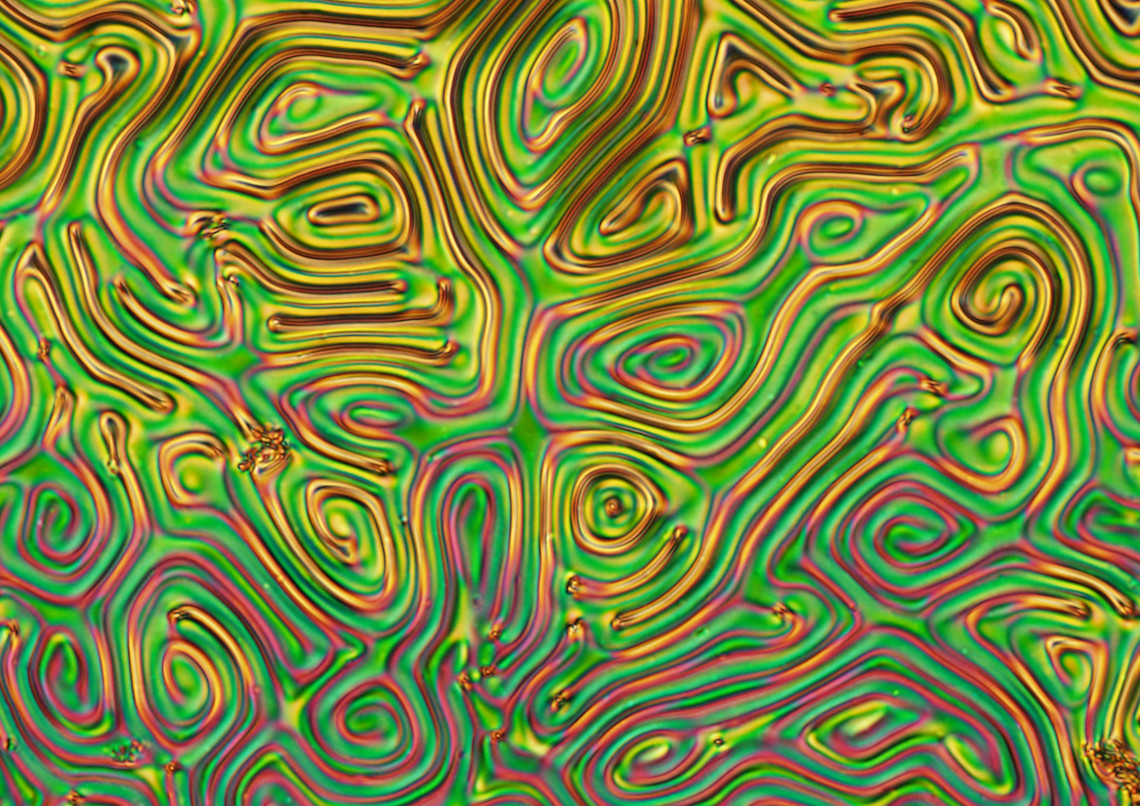 Volgens Nathalie Katsonis zit schoonheid ‘niet in kleuren, vormen of symmetrie, maar in de gedachten die bij de afbeelding opgewekt worden’. Katsonis is op zoek naar nieuw soort materiaal, een vervanger voor plastic. Dit doet ze door te kijken naar liquid crystals (zoals op de foto), stoffen die tussen de vloeibare en vaste vorm in zitten.