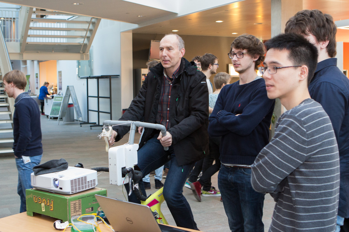 Tegenover The Wall staat een hometrainer opgesteld. Wie gaat trappen, kan de hele wereld over fietsen. En dat is ook zien op het scherm tegenover hem of haar. Want daar beweegt het landschap mee met jouw fietstempo. En als je bijstuurt, dan kun je zomaar een route nemen. Daardoor krijg je echt het gevoel je in het landschap te begeven, tussen de bergen. Wij wilden laten zien hoe leuk het kan zijn om te bewegen en dat je overal ter wereld kan komen’, vertelt Leron Kok, een van de vijf studenten die dit ontwikkelden.