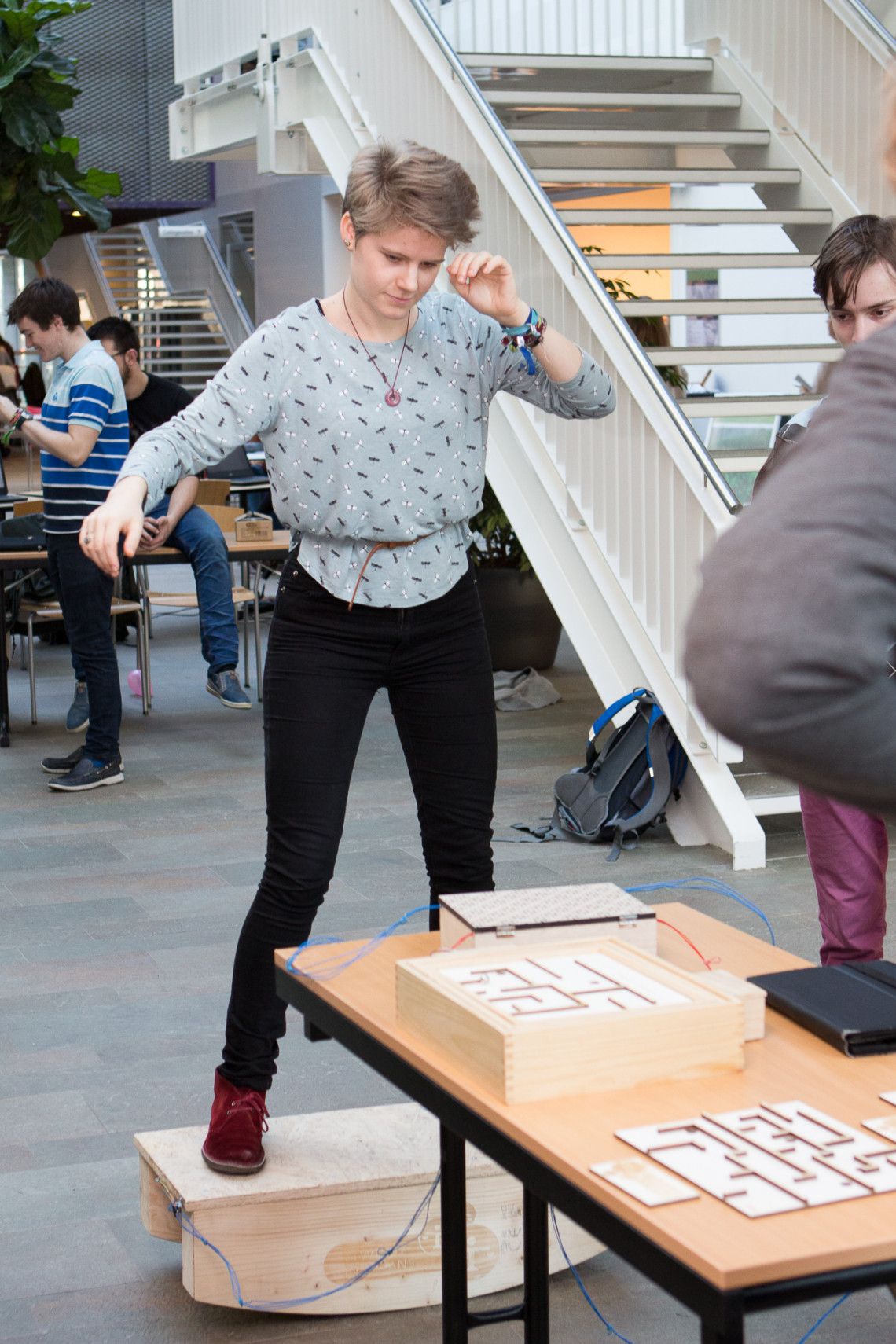 Balance Board is een spel waarbij je een balletje door een labyrint moet sturen, en dat doe je door zelf in balans te blijven op een balansbord. Een pittige uitdaging. ‘Maar we hebben het getest met verschillende ouderen, en dit moeten ze wel kunnen’, vertelt Nynke Tilkema, die meewerkte aan het ontwerp. ‘Het is niet té moeilijk.’ Het is volgens Nynke toeval dat ‘Twente in Balans’ een belangrijk slogan is van de GGD Twente, waar de komende tijd veel op wordt ingezet. ‘Maar ik weet dat de GGD dat wel heel tof vindt.’