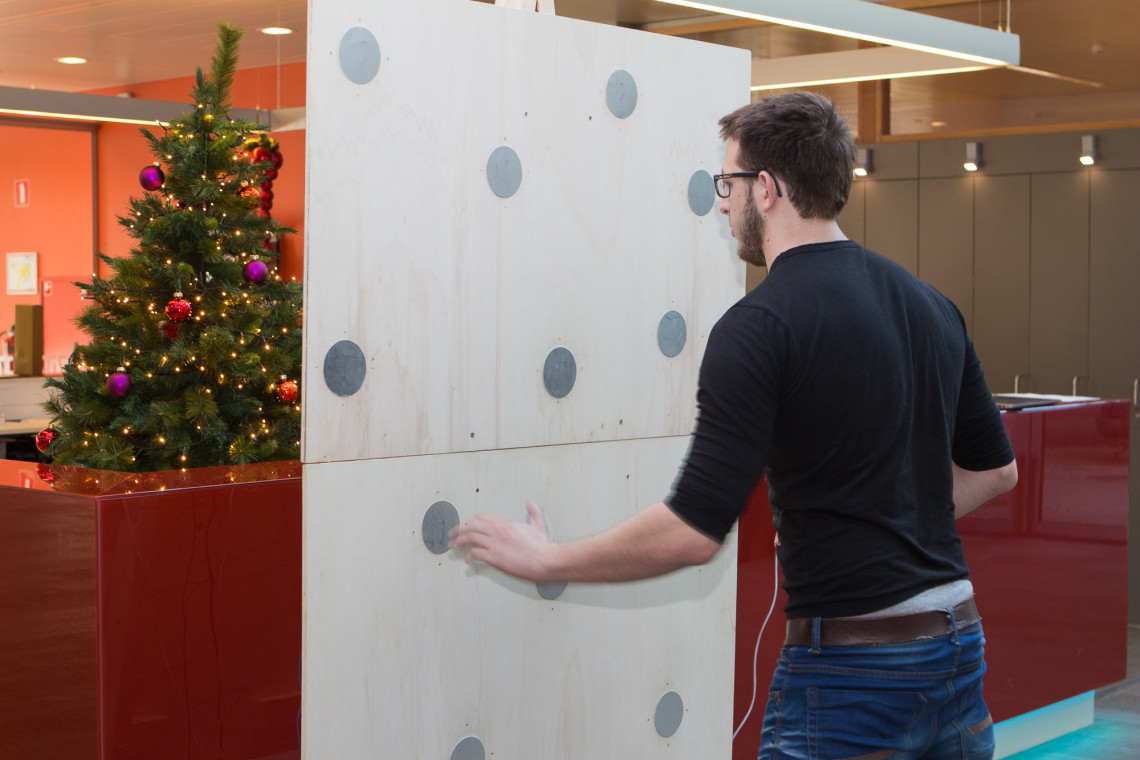 Als je het behendigheidsspel ‘The Wall’ één keer hebt gespeeld, wil je nog een keer. En juist dat maakt het leuk om te doen. Studenten Egbert van Loeffen en Simon Rezelman zijn twee van de vijf bedenkers van de spel. En ze zijn best trots op het eindresultaat. ‘Al kan het hier en daar nog best beter’, vinden ze. The Wall is een bord, met verschillende ronde schijven die door lampjes oplichten op de melodie van een door jou gekozen muziekje. Aan jou om zo snel mogelijk een oplichtende schijf aan te tikken. ‘We zijn naar het Gilde College geweest om daar met vmbo-scholieren te praten over wat hun aansprak. Dat het iets moest zijn met veel lichtjes en kleuren werd toen wel duidelijk.’