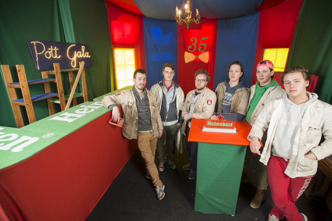 Max: ‘Het Pott-gala is sowieso bijzonder, het wijkt af van de normale regels. Het merendeel staat hier zonder date en is gewoon een avond aan het zuipen met zijn of haar clubje. Zelf lopen we er ook niet helemaal volgens de gala-regeltjes bij, want onder onze rokkostuums prijken gouden sneakers.