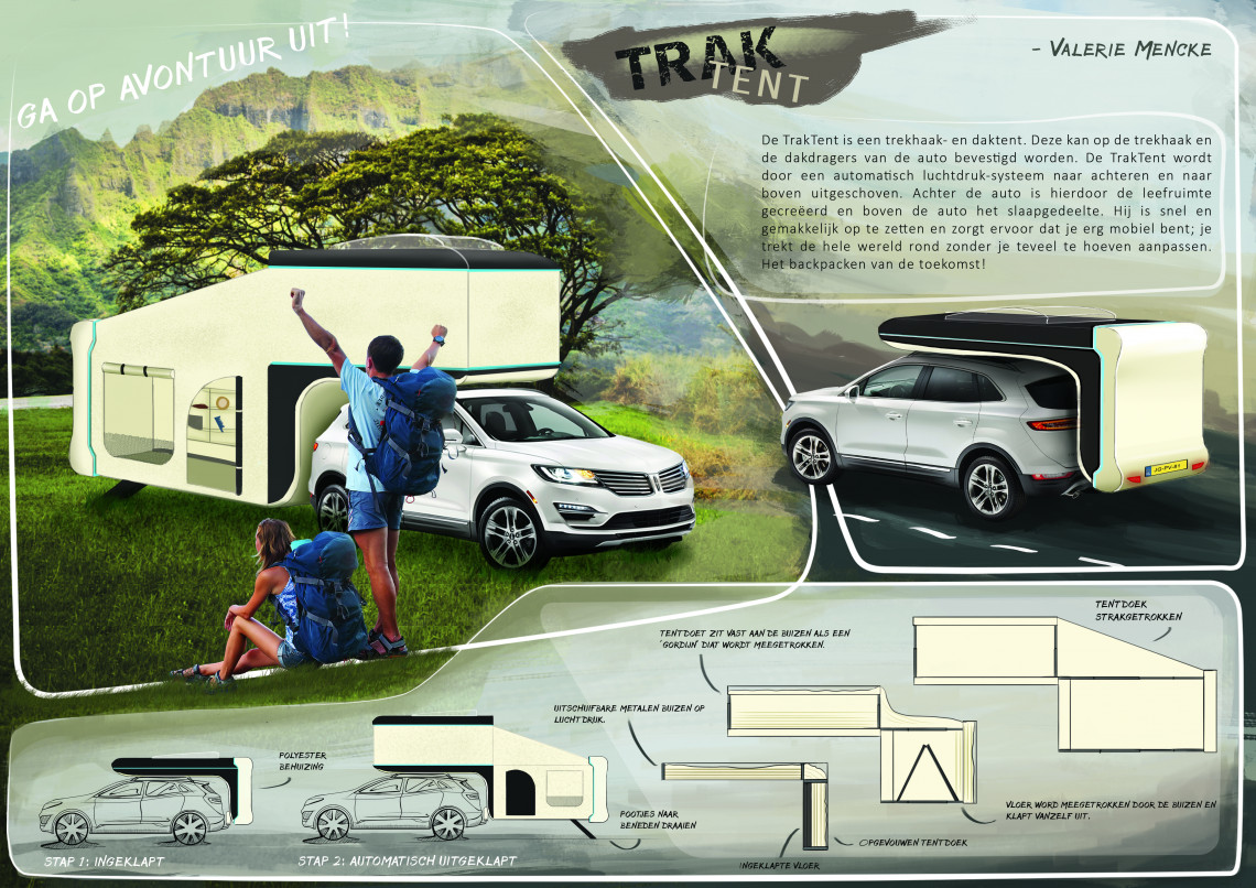 Valerie over haar Traktent: ‘Dit is een ontwerp voor de backpacker van de toekomst, waarbij je een tent hebt die op de trekhaak en dakdragers bevestigd is. Het slaapgedeelte is op het dak en achter je auto heb je nog een klein leefgedeelte. Als je onderweg bent is de constructie ingeklapt, maar op bestemming kun je hem zo uitklappen en erin slapen. Door het dakraam wat erin zit heb je zelfs een mooi uitzicht op de sterrenhemel.’