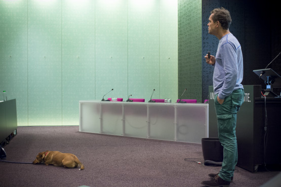Zo vergeleek hij zijn hond – die hij mee had genomen naar zijn presentatie – met mobiele telefoons. ‘Honden lopen al een paar duizend jaar rond, aan hun aanwezigheid zijn we gewend. Aan de telefoon niet.’ Bakker vervolgde: ‘De firma Apple verleidt ons om zo’n ding te kopen, maar dat heeft ook nadelen. Apparaten beïnvloeden ons psychisch welbevinden.’