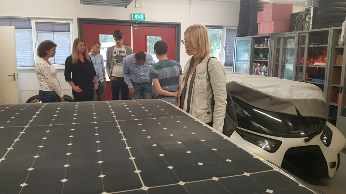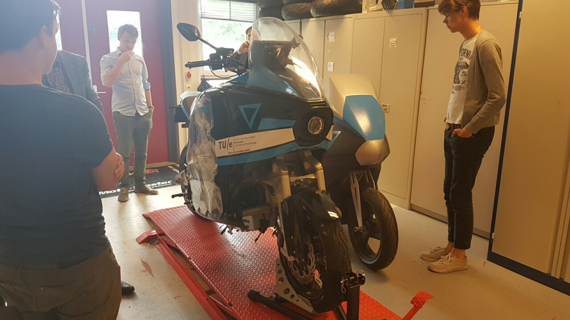 Een rondleiding door het gebouw brengt de UT-delegatie onder andere langs ruimtes van het Eindhovense solarteam, een drone racing team en team STORM, dat een elektrische motorfiets bouwt die komende zomer in tachtig dagen de wereld rond moet gaan rijden.