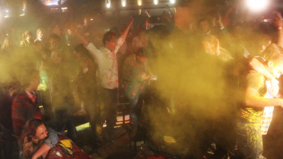 Desalniettemin kon het terras toch mooi meegenieten van de grote finale, de escalatie. Daarbij kleurde de verfwolken boven de schachten in rood-wit-blauw-oranje en werd het Wilhelmus ten gehore gebracht. Enkele studentikoze terrasgangers kwamen daar overigens ook niet ongeschonden vanaf, want ook zij werden gekleurd door het verfpoeder.