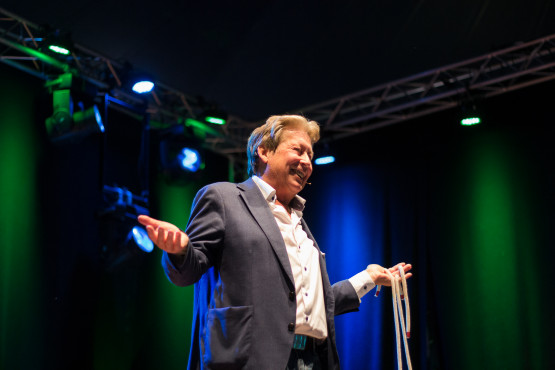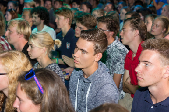 Die toverde op zijn beurt uiteindelijk de door Iris gekozen kaart (opgerold) uit de sinaasappel – al had een fotograaf nog het laatste stukje in bezit. En daarmee besloot Hans Kazàn zijn optreden. Maar niet voordat hij alle nieuwe studenten een fantastisch jaar tegemoet wenste.