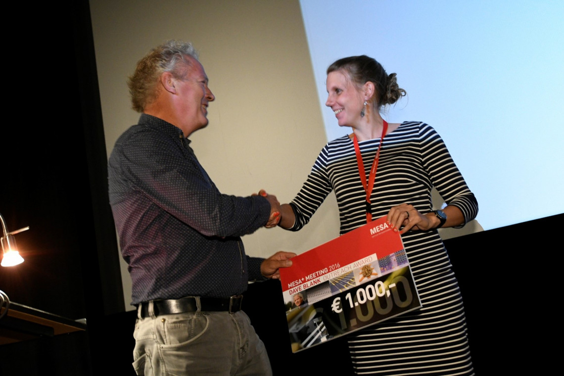 This year’s Dave Blank Outreach Award, consisting of €1.000 to be spend on outreach activities, was given to Loes Segerink. Since the beginning of her PhD research, Segerink has been a highly communicative researcher and she has actively presented her research - developing a test for the fertility of sperm – in various media.