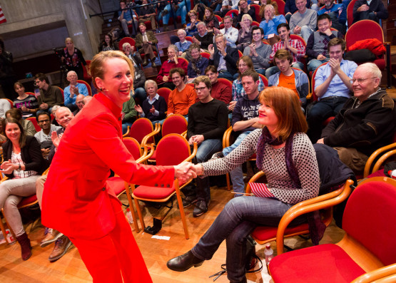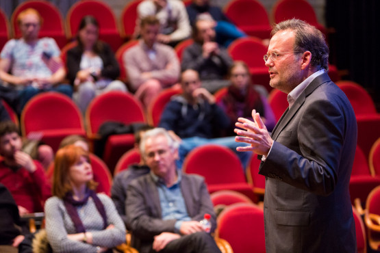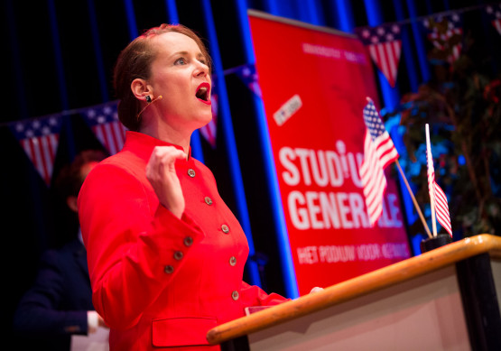 Afterwards, the aforementioned actors presented typical speeches of Trump and Clinton, written by Hans de Bruijn. ‘I’m happy to be here in Twente. Twente always wins. You are winners. Groningen – losers. Wageningen – losers. You are winners,’ said Vincent Linthorst as Donald J. Trump, while actress Jet Pagnier, portraying Hillary Clinton, began on a different note: ‘I believe in cooperation, not conflict. I believe in unity. Thank you for this university that you have built together.’