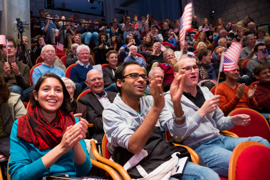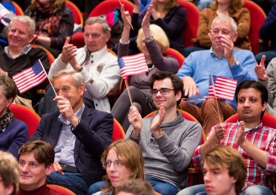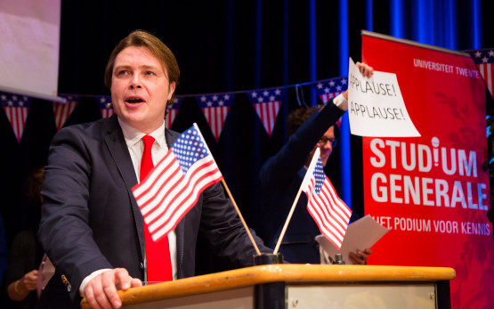 Accompanied by applause and waving of American flags, ‘Clinton and Trump’ visited the University of Twente. On the night of this historic US election, actors portraying the two presidential candidates joined a Studium Generale event focused on rhetorical tricks these politicians use.