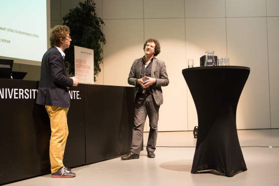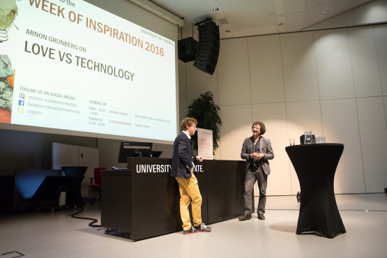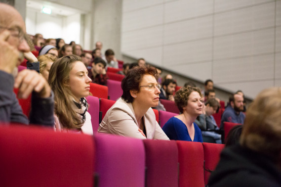 Na het verhaal en de pauze is er ruimte voor vragen. De zaal was bij het eerste gedeelte redelijk gevuld, voor de discussie blijft maar een fractie zitten. Techniekfilosoof Peter-Paul Verbeek is de enige die vragen stelt. ‘Als research voor Het Bestand en voor dit verhaal, heb ik me een tijd onder hackers begeven’, zegt Grunberg. ‘Daar zag ik idealisme, maar ook een afkeer van de bestaande wereld. Het had religieuze elementen, de groep deelt een groot vertrouwen in een betere wereld.’