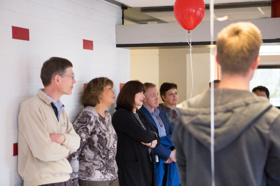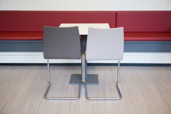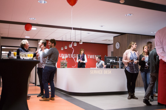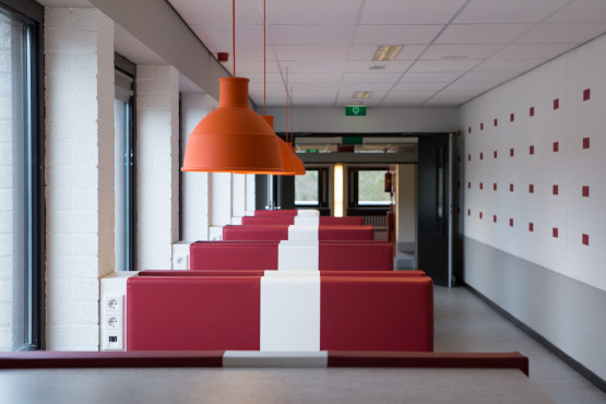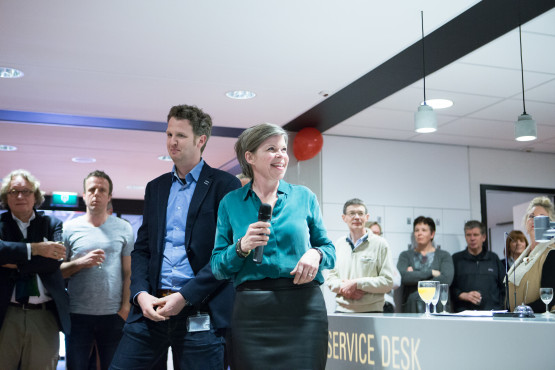 Daarna namen de studenten de honneurs waar. Ze wezen op de kleuraccenten: ‘Mooi rood met zwartgrijze tinten’. Maar vooral de grote hoeveelheid aan stopcontacten bij de studieplekken kregen aandacht. ‘We zijn natuurlijk maar arme studenten met goedkope laptops en slechte batterijen. Nu kunnen we langer dan twee uur werken aan opdrachten.’ Na een rondleiding van zo’n vijftien minuten langs vernieuwde pantry’s en vergaderzalen was het tijd voor een borrel in de nieuwe ‘home base’.