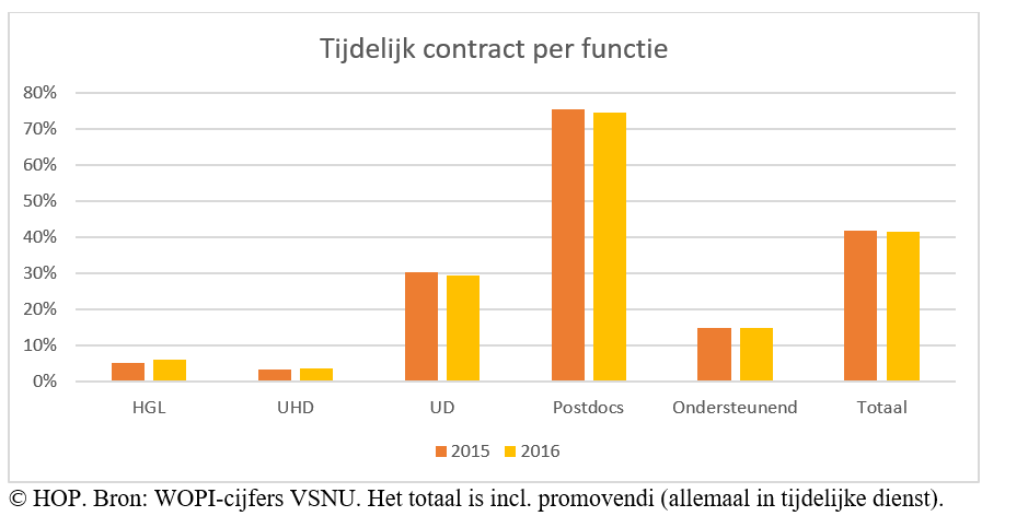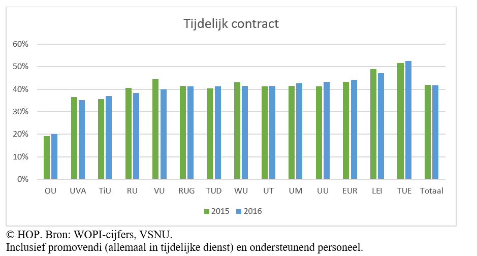 In 2016 was 41,7 procent van het universitaire personeel in tijdelijk dienst, blijkt uit de nieuwste cijfers van universiteitenvereniging VSNU. Dat is een daling van 0,3 procent ten opzichte van 2015.