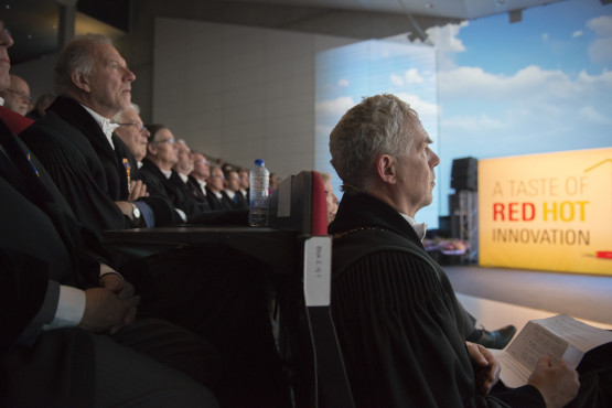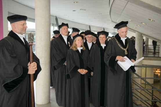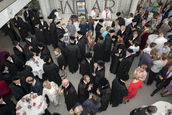 De rector en het cortège maken zich klaar voor de plechtigheid.