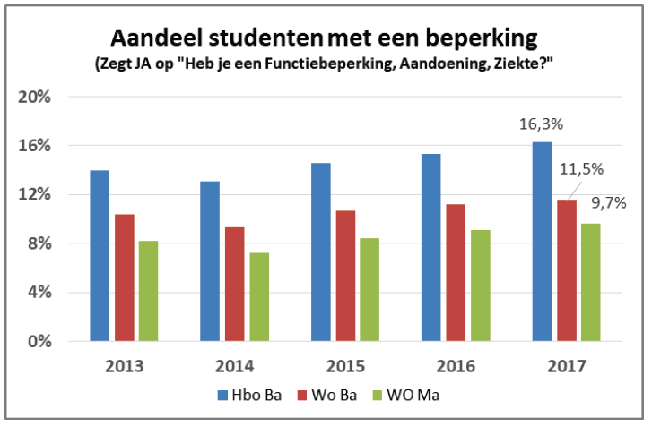 Deze groepen studenten dringen kennelijk minder tot de masteropleidingen door. In bachelorfase heeft 16,3 procent (hbo) en 11,5 procent (wo) een beperking. In wo-masteropleidingen is dat slechts 7,9 procent.