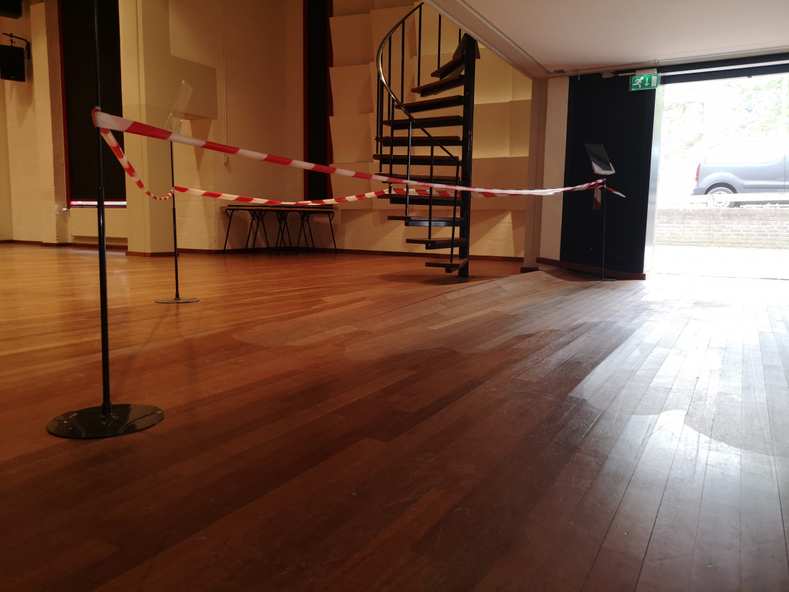 Een andere ruimte in de Vrijhof die met waterschade kampt is de Audiozaal, op de begane grond. Een deel van de vloer bij de nooduitgang is omhooggekomen en is nu afgezet met lint. ‘We hebben de verenigingen per mail geïnformeerd dat het gedeelte onder het balkon niet gebruikt kan worden. Op de rest kan nog prima gedanst worden’, zegt Frans de Groot, theatertechnicus bij Vrijhof Cultuur. Volgens Klumpert is het nog kijken of de vloer volledig vervangen moet worden of dat er nog andere oplossingen mogelijk zijn.