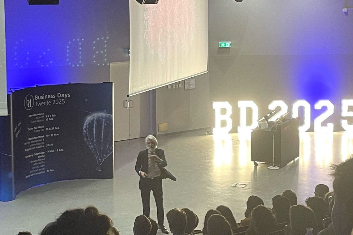 Na afloop van de lezing ontving ‘JP’ naast een oorverdovend applaus ook nog een typisch UT-studentenbedankje: een onvervalste Grolsch beugelfles.