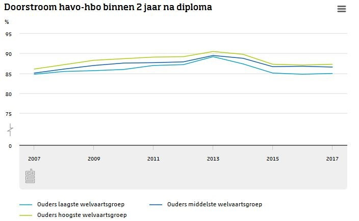 Een verklaring voor deze teruggang naar het niveau van 2007 geeft het CBS niet, maar met inkomensverschillen lijkt het weinig van doen te hebben. Van de havo-gediplomeerden in 2017 uit gezinnen in de laagste welvaartsgroep studeerde 85 procent binnen twee jaar aan een hogeschool. In de hoogste welvaartsgroep was dat met 87,3 procent iets hoger. Deze verschillen zijn de laatste jaren niet groter geworden.
