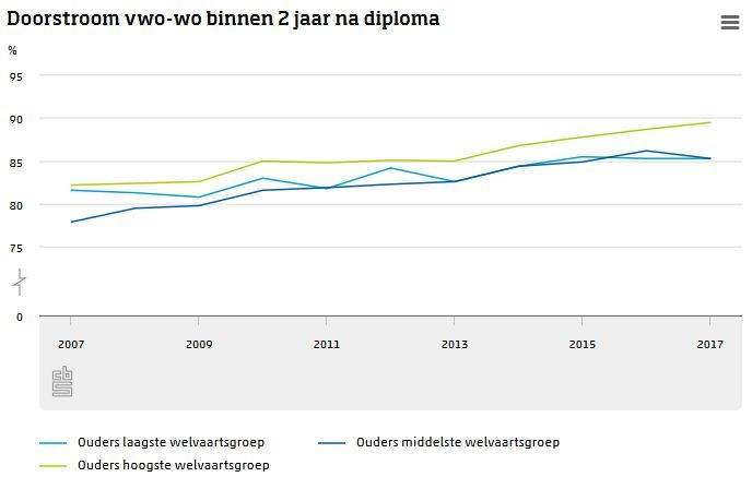De doorstroom van vwo naar wo bleef zelfs stijgen na de invoering van het leenstelsel. Het aandeel vwo’ers uit gezinnen met de hoogste inkomens dat binnen twee jaar naar de universiteit ging, groeide van bijna 88 procent in 2015 naar bijna 90 procent in 2017. Bij de laagste twee welvaartsgroepen bleef de doorstroom stabiel op ruim 85 procent.