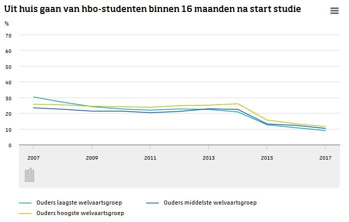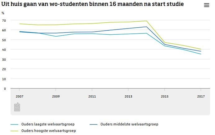Van de studenten die zich in 2017 aan een universiteit inschreven, woonde gemiddeld 41 procent na zestien maanden op zichzelf. In 2015 was dat nog 46 procent, een scherpe daling ten opzichte van het gemiddelde van ruim 60 procent in de jaren 2007–2014.