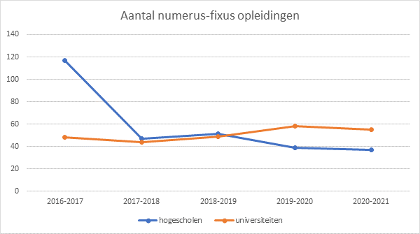 Bij de hogescholen neemt het aantal studies met een studentenstop ook maar licht af: van 39 naar 37. Van de tien bekostigde opleidingen fysiotherapie hanteren er nog altijd zes een numerus fixus. Bij de voltijdopleidingen medische hulpverlening gelden komend studiejaar tegen de verwachting in nog steeds beperkingen.