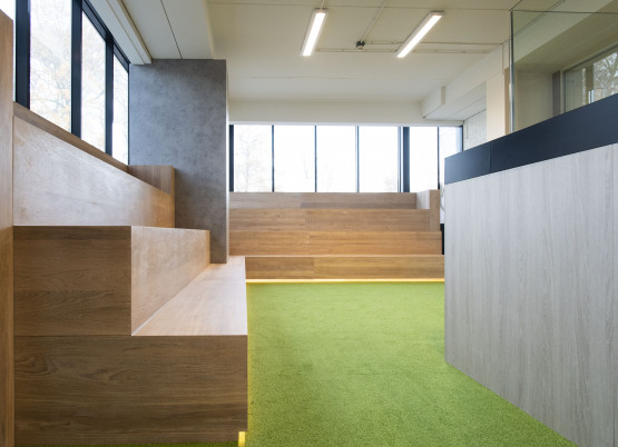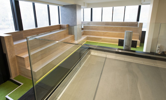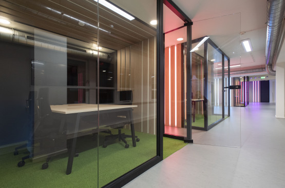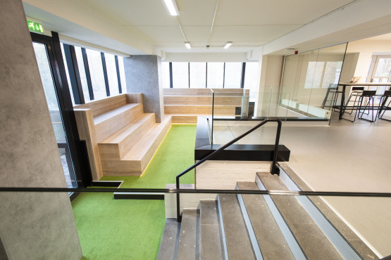 Incubase heeft ook een pitch-arena, met kunstgrasmat en tribune met plaats voor dertig tot veertig toeschouwers. Het idee hierachter? Dit is de plek waar experts masterclasses geven. En iedere maand pitchen nieuwkomers hier hun ideeën. Verkouter: ‘We willen allemaal weten wat je doet. Dus ook mensen die er al wat langer zitten delen hun voortgang. Het idee is dat je elkaar constant motiveert.’