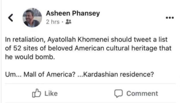 Ter vergelding zou de Iraanse leider 52 doelwitten in Amerika moeten kiezen, bedacht een docent van Babson College, een gerenommeerde business school in Boston. Bijvoorbeeld de ‘Mall of America’ of het huis van de Kardashians.