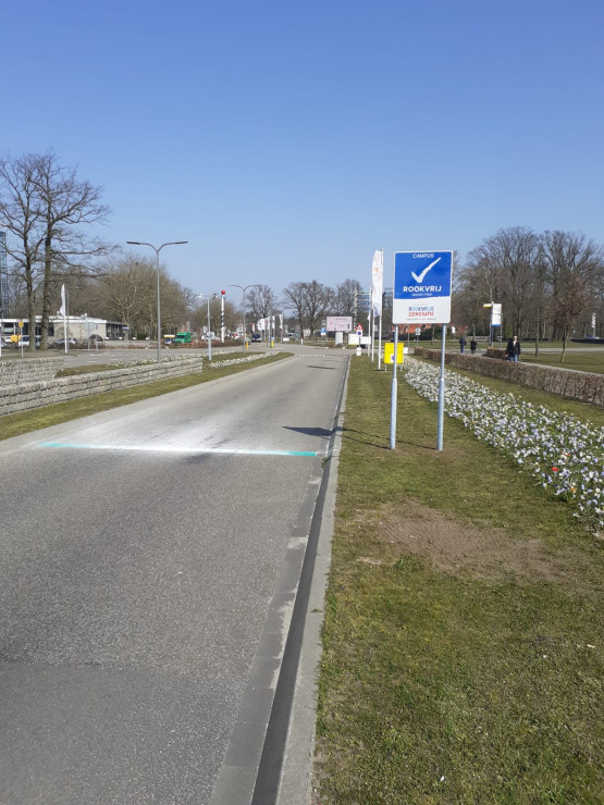 Asbestsanering in de Cubicus en een bord en markering om te bevestigen: de campus is rookvrij.