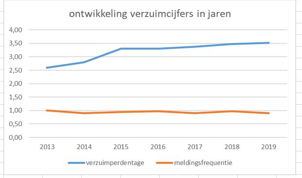 Graph showing absenteeism percentage (in blue) and reporting frequency (in orange) . Source: Annual Review 2019 of UT’s Occupational Health Service Arbo Unie