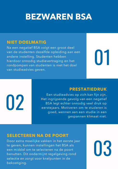 Het klinkt het Interstedelijk Studenten Overleg allemaal als muziek in de oren. Weg met dat bsa, denkt het ISO. Een puntig pamflet moet de partijen over de streep trekken. Het bsa kost geld en het zorgt voor stress, zijn de argumenten. En soms is het een stiekeme vorm van selectie ná de poort met een paar extra moeilijke vakken in het eerste jaar.