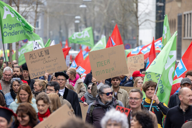 Maar de boodschap is serieus: de studentstakers eisen de mogelijkheid om schuldenvrij te studeren en volledige compensatie voor de ‘pechstudenten’ die de basisbeurs zijn misgelopen. ‘Vandaag laten we niets aan het toeval over’, roept LSVb-voorzitter Lyle Muns vanaf het podium. ‘Niet mijn schuld’, juichen de studenten terug.