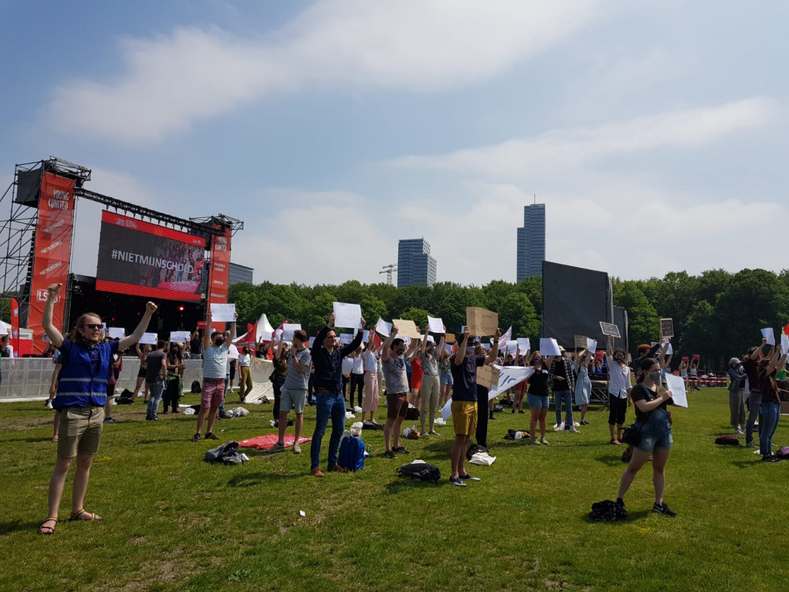 Muisstil was het dan weer op het Malieveld tijdens het spoken-word optreden van de 19-jarige Amara van der Elst, die dit jaar ook optrad bij de nationale Dodenherdenking op de Dam. Wanneer er later op het podium een lied over de basisbeurs wordt gezongen (‘een ode aan een verloren liefde’) wordt er op het hele veld gedanst. Het is erg warm, dus her en der gaan de mondkapjes af, maar mensen houden in elk geval afstand.