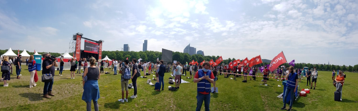 De sfeer doet aanvankelijk denken aan een festival. De zon schijnt, mensen smeren zich in met zonnebrand, er is een groot podium en er zijn dranghekken. Studenten met felgekleurde hesjes aan delen lunchpakketjes uit en zorgen dat iedereen netjes afstand houdt.