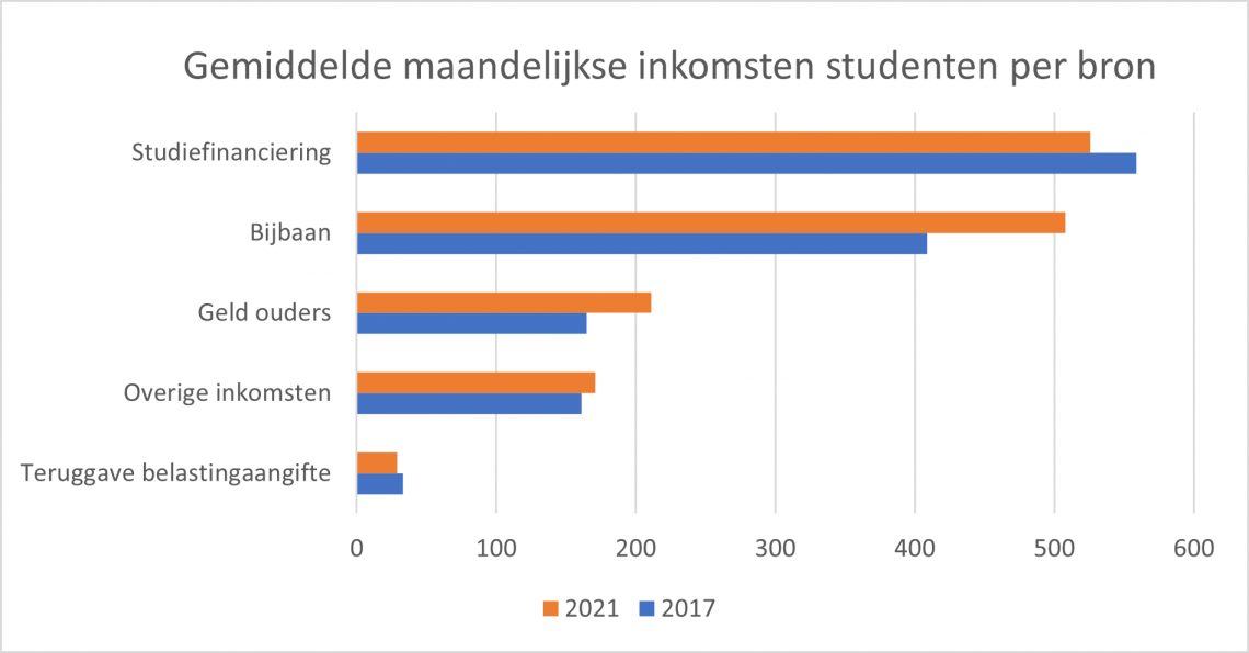 Hoewel studenten op financieel vlak steeds afhankelijker worden van hun ouders, blijven hun belangrijkste inkomstenbronnen de studiefinanciering en hun bijbaan, blijkt uit het Nibud-onderzoek. Dat levert maandelijks respectievelijk 526 euro en 508 euro op.