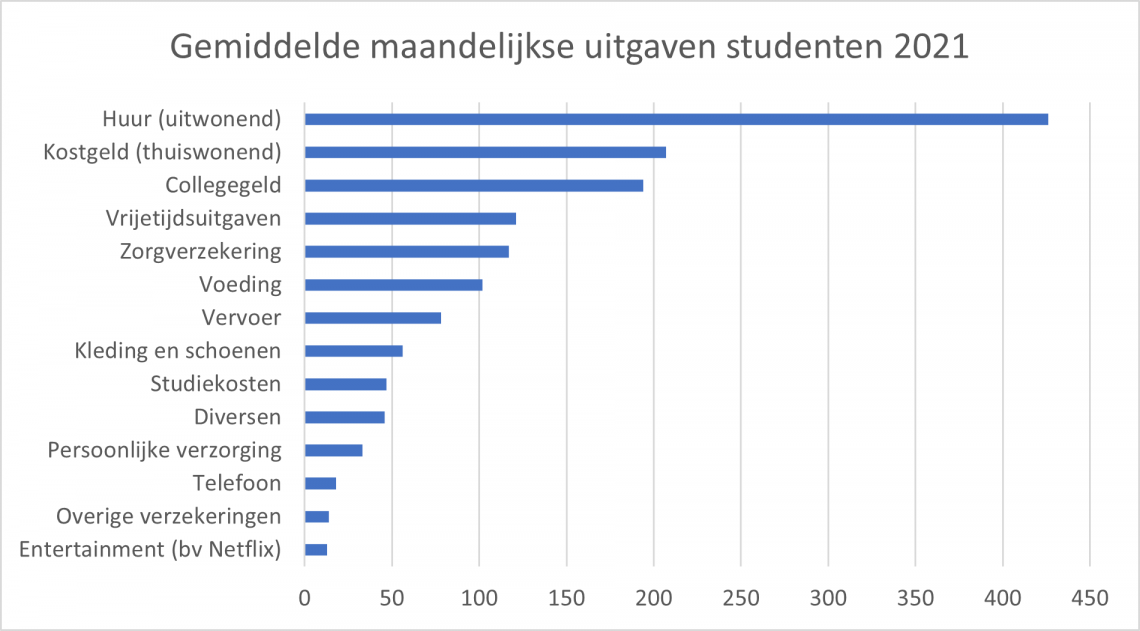 Maar student zijn is niet gratis, dus dat geld vliegt er ook snel weer uit. Huur (of kostgeld voor thuiswonenden) en het collegegeld zijn nog altijd de grootste kostenposten. Daarna komen de vrijetijdsuitgaven, zoals avondjes uit, etentjes en vakanties. Hieraan gaven studenten in 2021 wel iets minder uit dan in 2017: dat komt vermoedelijk door de coronacrisis, aldus het Nibud.