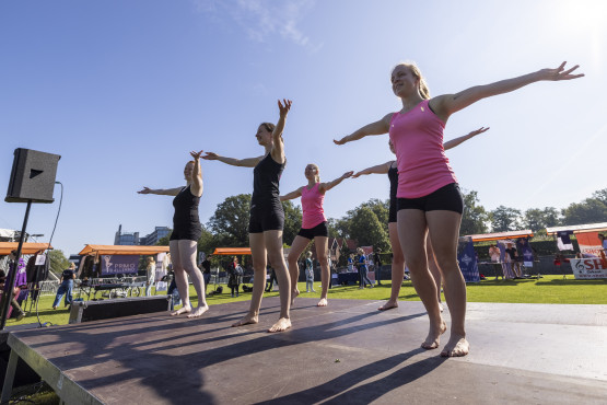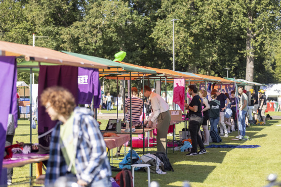 Eerstejaars die vanaf dat punt teruglopen naar de entree, treffen achter de grote tent alle studie- en cultuurverenigingen. Op een klein podium wisselen de dansverenigingen elkaar af. Van salsa tot stijl, van jazz tot modern. De ene sjaars kijkt twijfelachtig toe, de ander beweegt ritmisch mee. Achter hen wappert de regenboogvlag van het Diversity & Inclusion kraampje, terwijl een kraam verder bijbels gratis aan de man of vrouw worden gebracht.