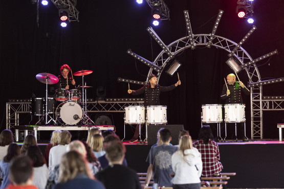 Julia Hubbert, voorzitter van de Kick-In commissie, heet de kiddo’s welkom en stelt haar medecommissarissen voor, gevolgd door applaus. Op beide schermen toont ze een gelikt openingsfilmpje, ondersteunt door stevige muziek. Ook Tom Veldkamp, rector magnificus, spreekt de eerstejaars toe en wenst ze al het geluk toe voor de komende jaren. Na een praatje van de Student Union, sluit Lucifers Slagwerk de show af met een drumact, waarna studenten rij voor rij de tent verlaten en hun doegroep opzoeken.