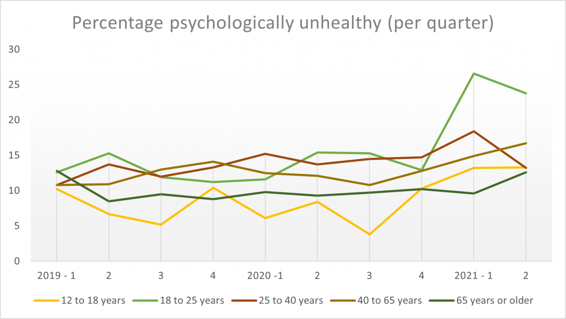 At the start of 2020, right before the first lockdown, approximately 12-15 percent of young people indicated that they were feeling down. One year later, this number was approximately ten percent higher. The difference is smaller in other age groups.