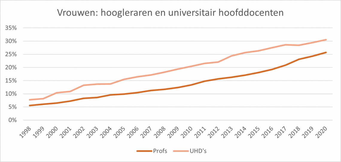 Het is een lange weg, maar hij gaat wel gestaag omhoog. In 1998 was maar zes procent van alle hoogleraren vrouw, inmiddels is dat 26 procent: ongeveer vier keer zoveel. Ook onder universitair hoofddocenten is het aandeel vrouwen verviervoudigd (naar 31 procent).