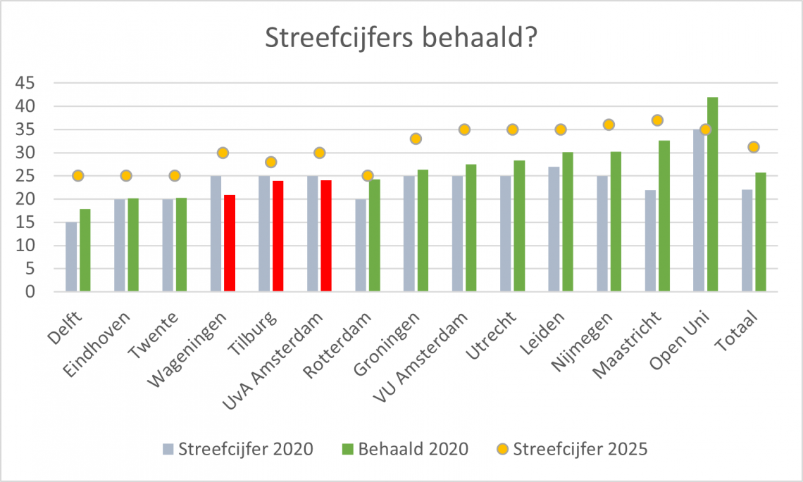 Vijf jaar geleden hebben universiteiten streefcijfers voor het jaar 2020 gekozen. De meeste hebben hun eigen streefcijfer overtroffen. Alleen Wageningen, Tilburg en de Universiteit van Amsterdam zijn daar niet in geslaagd.