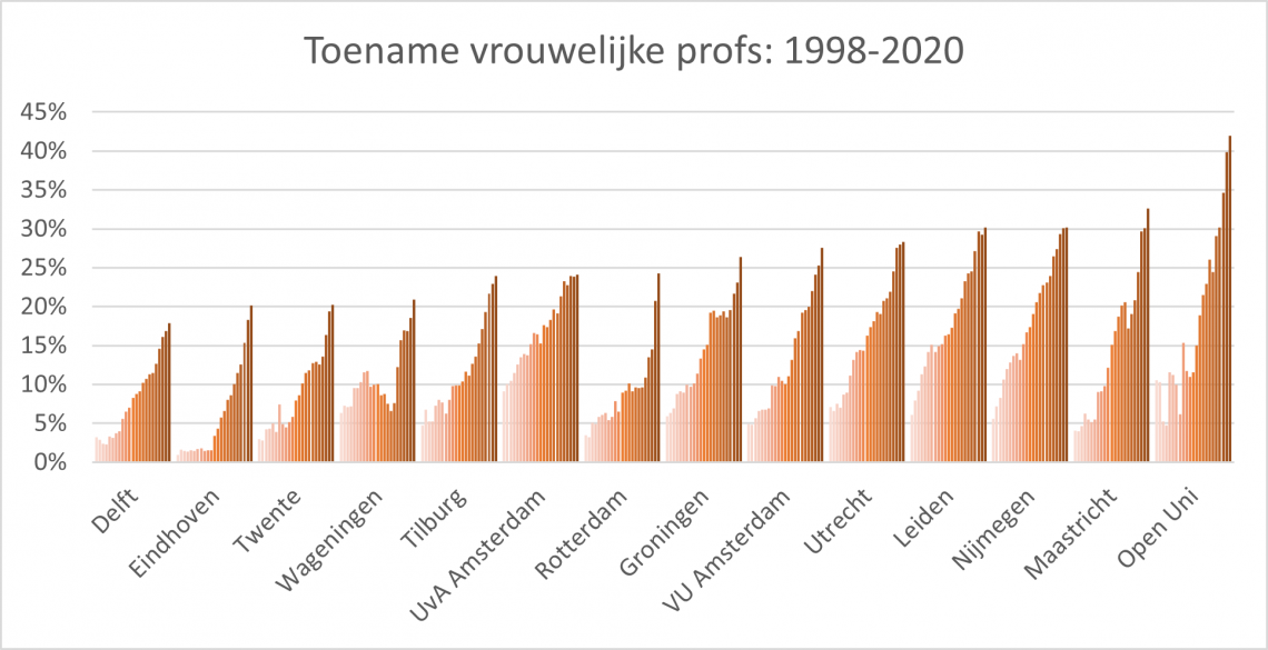 Overigens is afgelopen jaar bij alle universiteiten het aandeel vrouwelijke professoren toegenomen, al moet je in Nijmegen achter de komma kijken om dat te zien: daar was de toename van 2019 naar 2020 slechts 0,05 procentpunt.
