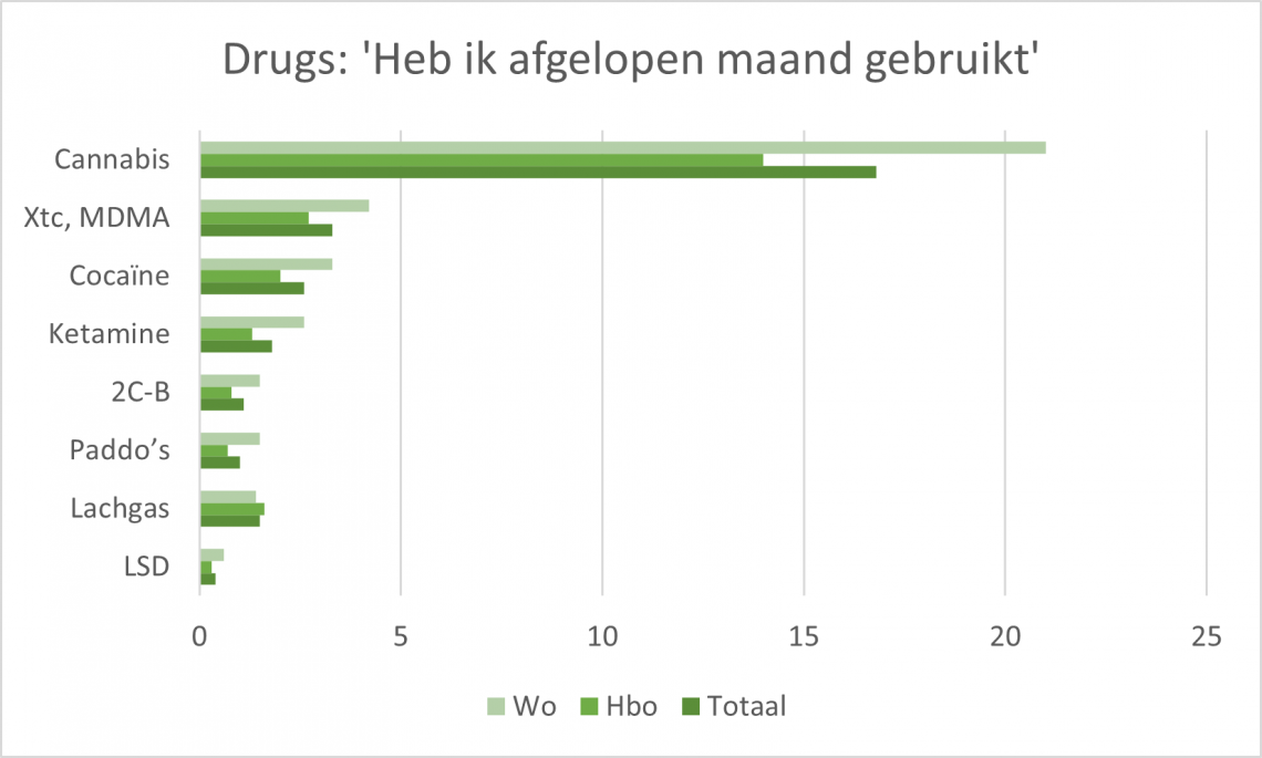 Cannabis blijkt behoorlijk geaccepteerd onder studenten. Een op de drie heeft dat in de voorgaande twaalf maanden weleens gerookt, en acht procent doet het wekelijks. De onderzoekers keken naar meer middelengebruik en verslavingen, waarbij vooral gamen opvalt: vijf procent doet dat te veel.