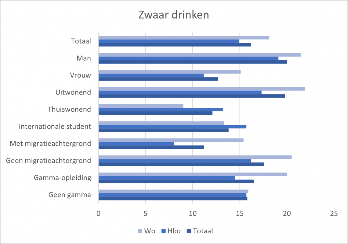 Ruim één op de vier studenten is een overmatige of zware drinker. Overmatig (11 procent) betekent voor mannen meer dan 21 glazen alcohol per week, en voor vrouwen meer dan veertien. ‘Zware’ drinkers (16 procent) nuttigen minstens één keer in de week zes glazen (mannen) of vier glazen (vrouwen).