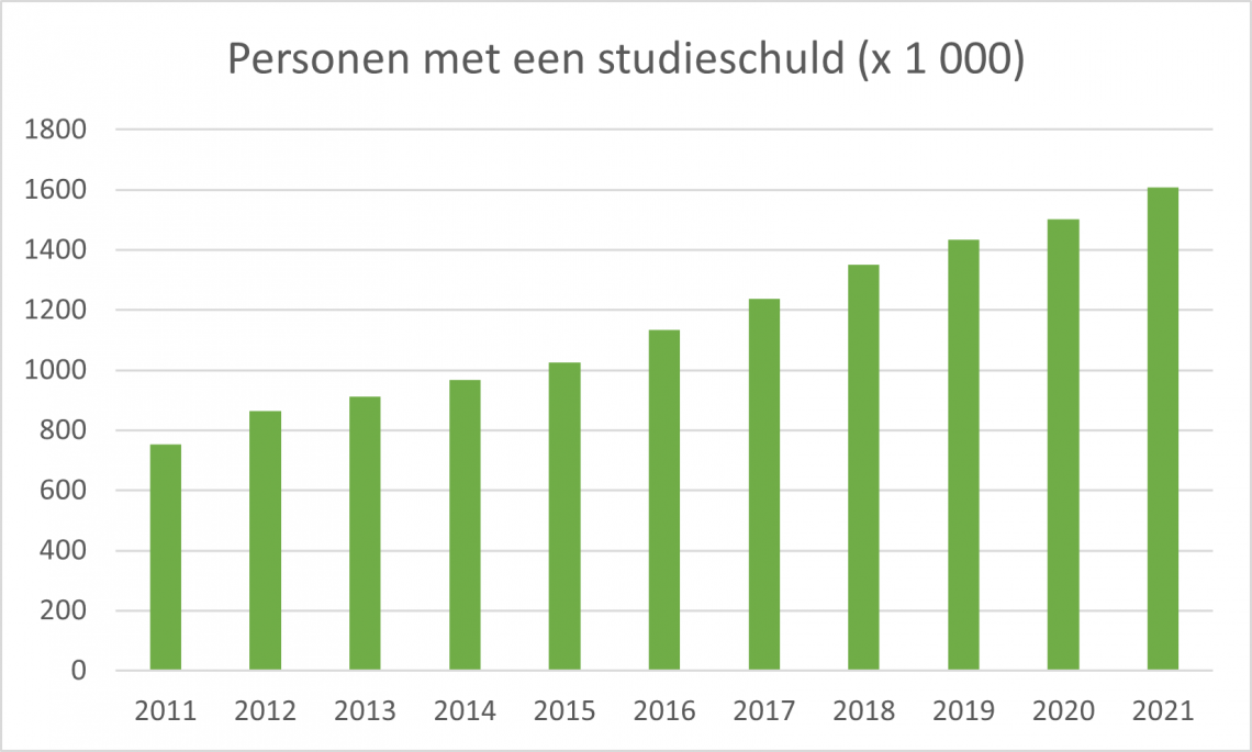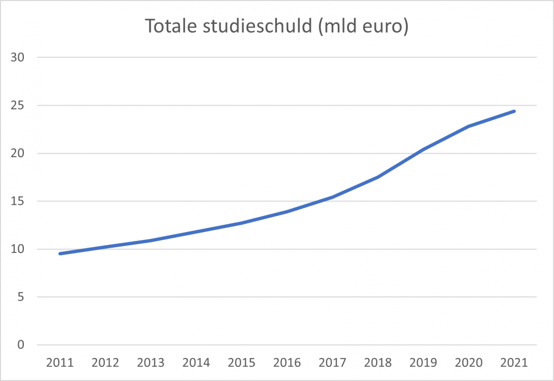 De totale schuld van studenten en oud-studenten neemt wel toe. Begin 2021 was het 24,4 miljard euro, zeven procent meer dan het jaar ervoor. De studieschuld is verdubbeld sinds de invoering van het leenstelsel.