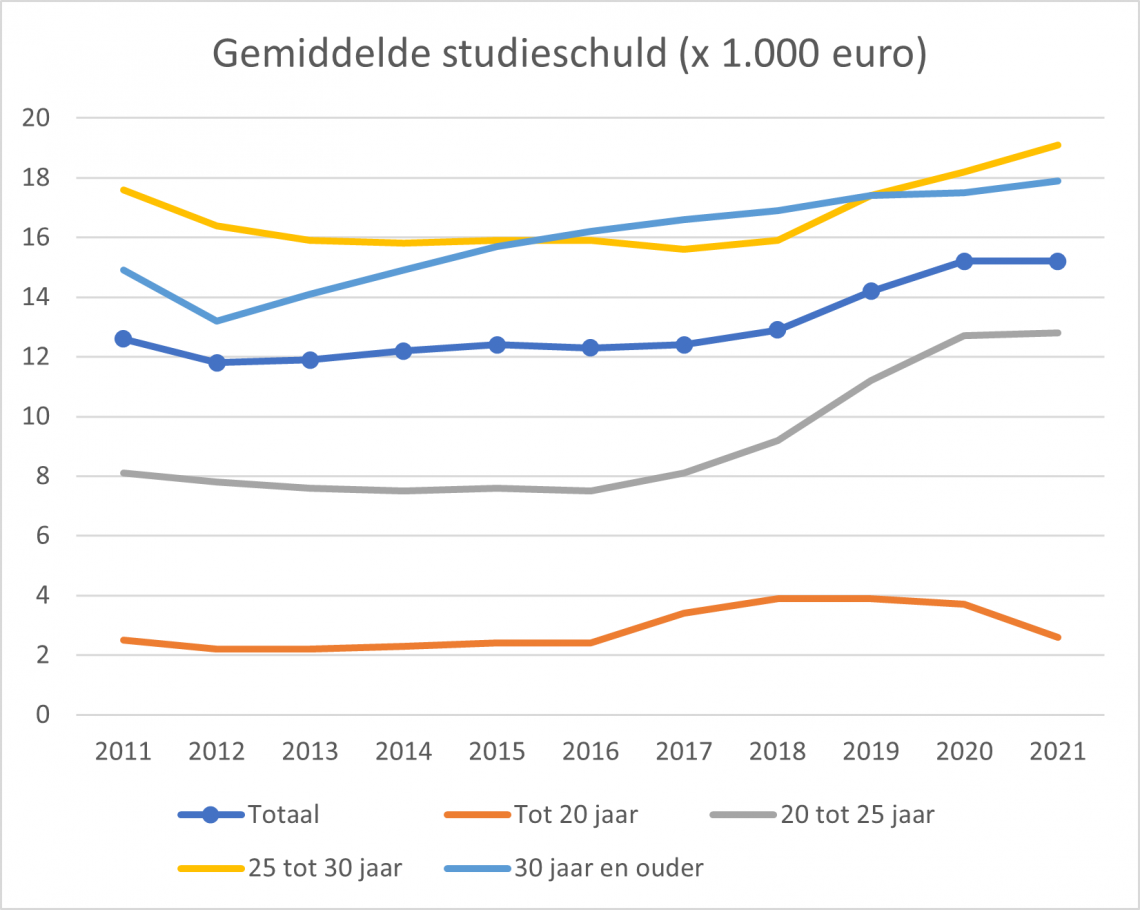 De gemiddelde studieschuld is sinds de invoering van het leenstelsel in 2015 opgelopen van 12,4 duizend euro tot 15,2 duizend euro begin 2020. Dat het bedrag sindsdien niet verder is gestegen, komt misschien door de steunmaatregelen van de overheid, zoals een halvering van het collegegeld.