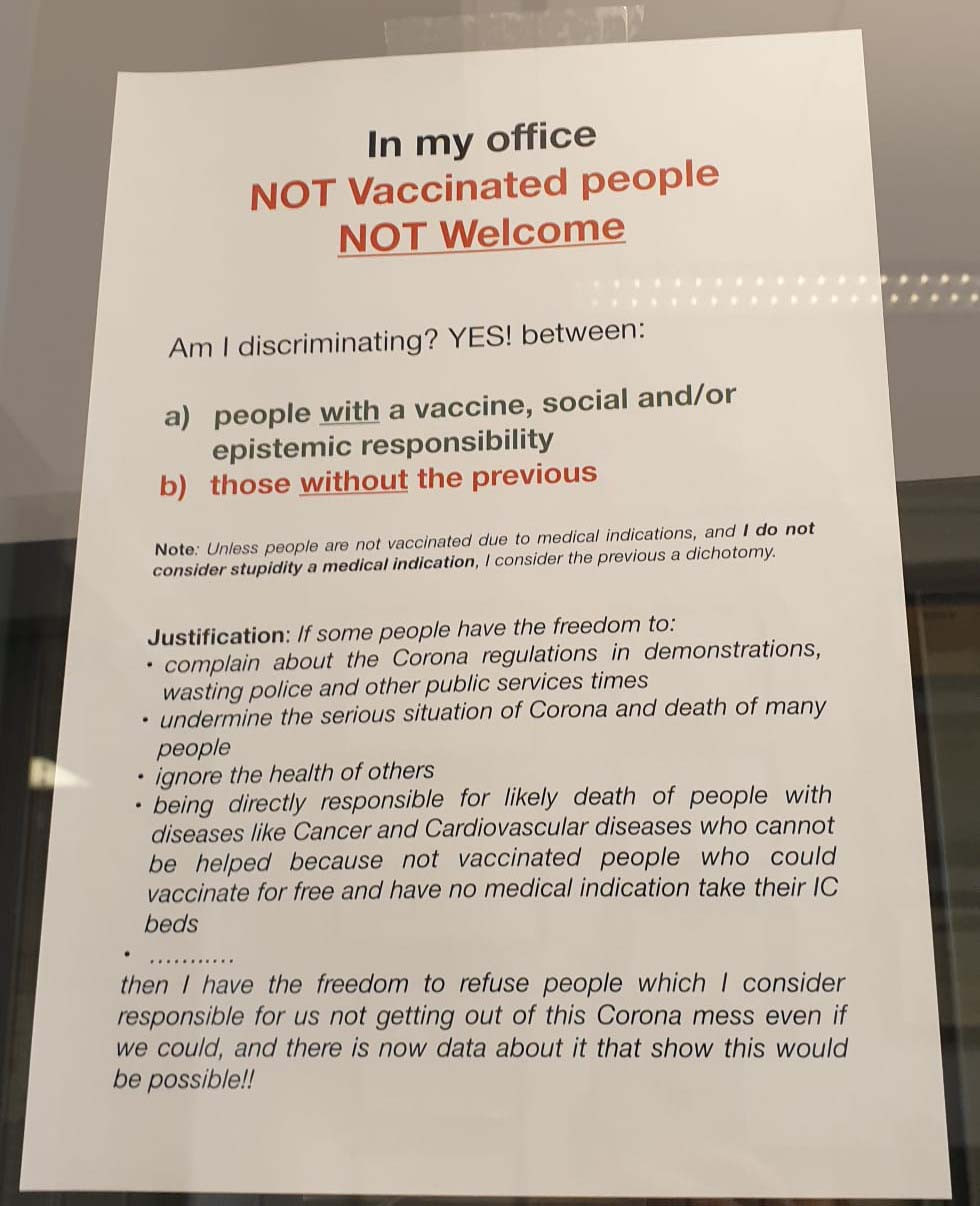 Het is zijn bedoeling dat het briefje tot discussie aanzet. ‘Ik geef niet voor niets zo’n duidelijk statement af. Ik zie mensen in de gang stoppen om te kijken, maar ik ben er nog niet op aangesproken.’ Hij heeft de decaan van zijn faculteit of het college van bestuur niet op de hoogte gesteld van zijn statement, laat hij weten, ook al stelt hijzelf zwart-op-wit dat hij met zijn statement discrimineert. ‘Zij hebben wel belangrijkere dingen te doen. Of ze dit als onwenselijk of tegen bepaalde regels zien? Dat zou goed kunnen. Ik maak dit statement niet uit gebrek aan respect, integendeel. Dit is vrijheid van meningsuiting. Maar ik ga gerust de discussie aan met mensen die dat willen – of willen dat ik dit briefje weghaal. En nee, dat laatste ben ik absolúút niet van plan.’