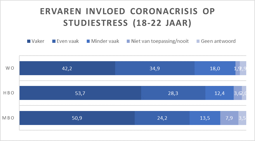Bijna de helft van de studenten heeft vaker studiestress dan voordat corona uitbrak, zeggen ze zelf. Een kleiner deel van de studenten had juist minder stress dan voorheen: één op de acht in het hbo en ruim één op de zes in het wetenschappelijk onderwijs.