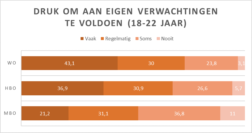 Maar de stress komt niet altijd van buiten. Studenten voelen ook de druk om aan hun eigen verwachtingen te voldoen. Opvallend is dat mbo-studenten hierin een stuk relaxter zijn dan studenten in het hbo en wo.