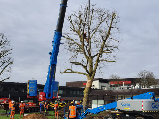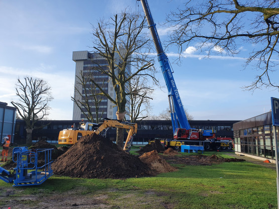 De megaklus die zo’n tien boomspecialisten van Quercus – allen voorzien van bouwhelm en veiligheidshesje – uitvoerden trok veel bekijks vanmorgen. André de Brouwer, contractmanager terrein bij Campus & Facility Management, was aanwezig om het project in goede banen te leiden. ‘Vandaag en morgen moet het gebeuren, maar we zijn hier al anderhalf jaar druk mee qua voorbereiding. En de nazorg komt daar ook nog bij’, aldus De Brouwer.